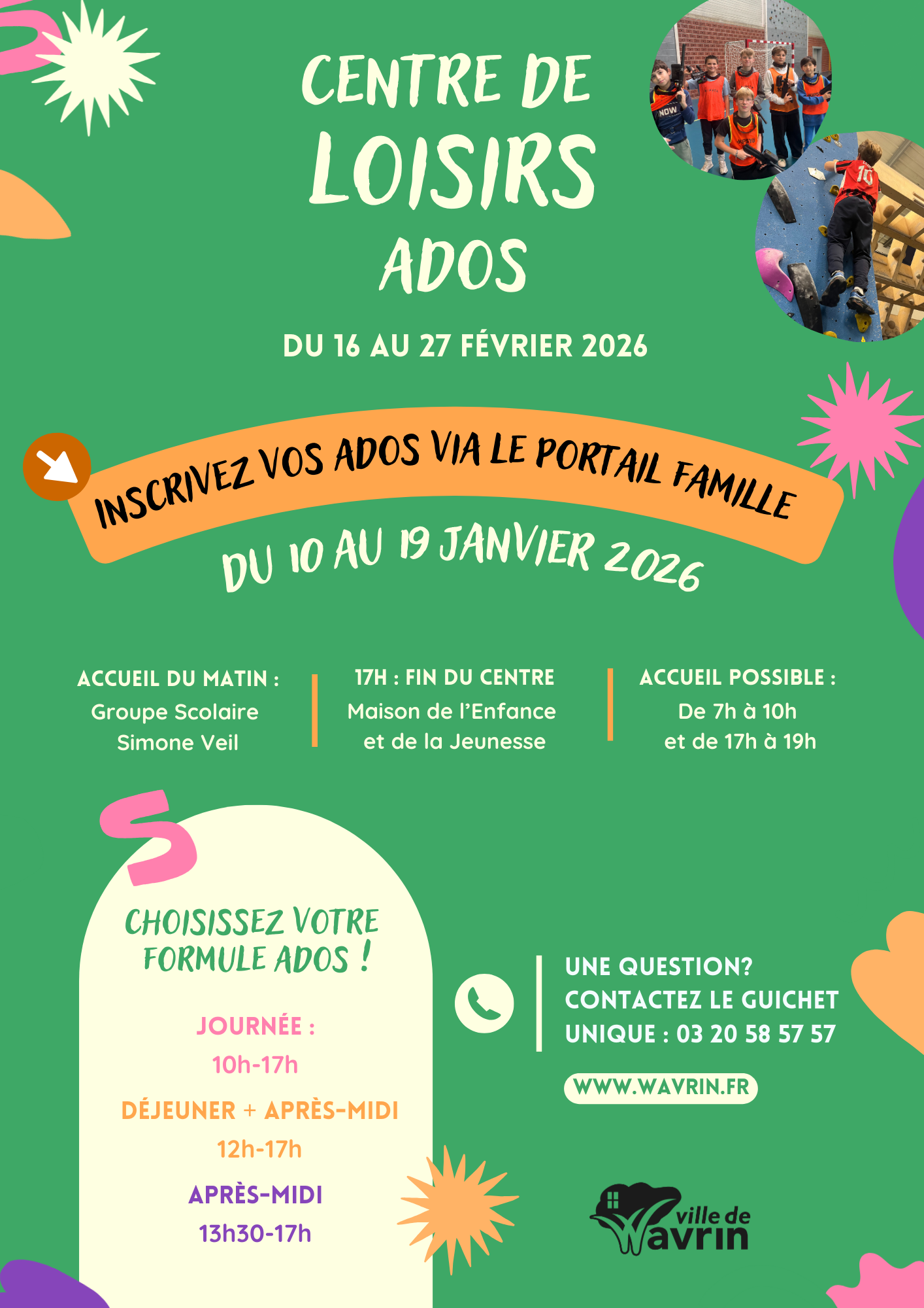 De 10h à 17h, avec cantine obligatoire (sauf formule ado 1/2 journée) . Merci de respecter les horaires.