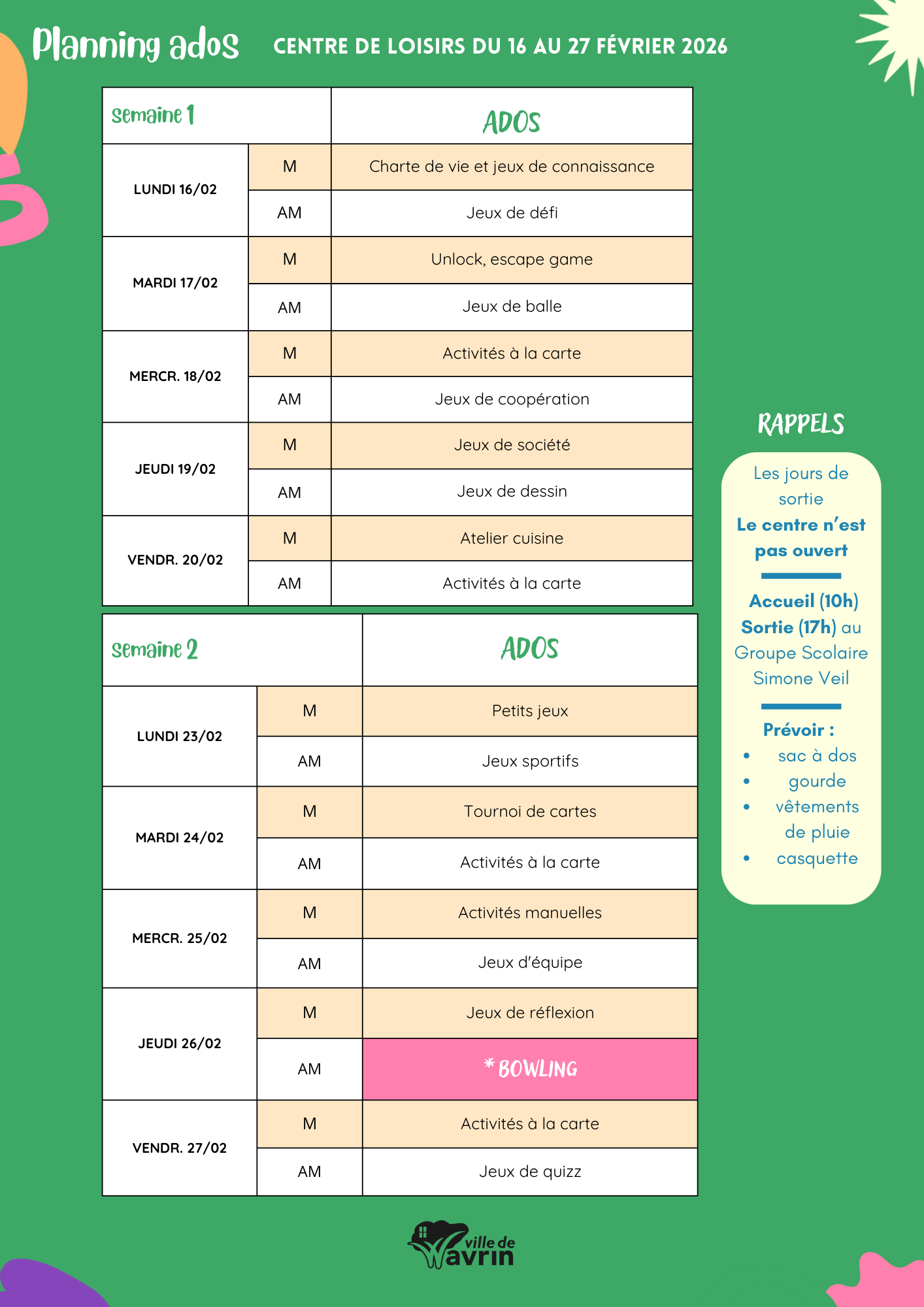 Le centre de loisirs de février aura lieu du 16 au 27 février
