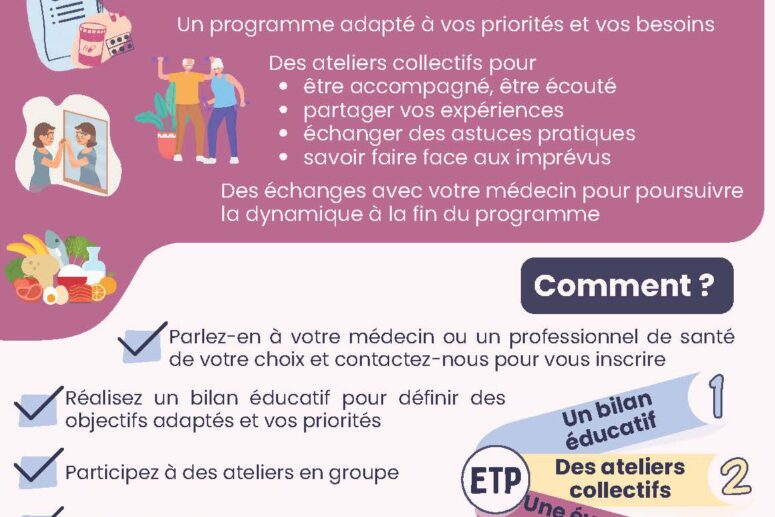 Ces ateliers sont animés par des professionnels de santé locaux formés à l’ETP et offrent une véritable opportunité pour les personnes atteintes de maladies chroniques :